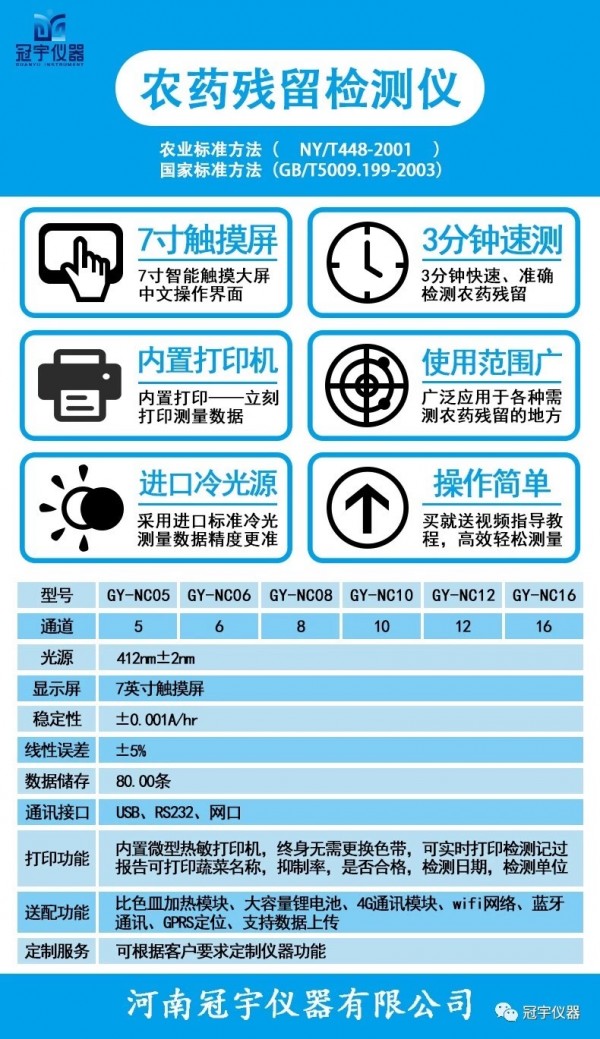 农药残留便携式快速检测仪、10通道农药残留测试仪、GY-NC10农药残留便携式快速检测仪是河南冠宇仪器有限公司生产的新一代智能型农药残留检测仪;GY-NC10农药残留便携式快速检测仪是根据农业标准方法(NY/T 448-2001)和标准(GB/T5009.199-2003)中的酶抑制率法,严格遵循《GB/T5009.199-2003蔬菜中有机磷和氨基甲酸酯类农药残留快速检测方法标准》中的规定对蔬菜中有机磷和氨基甲酸酯类农药残留的快速检测。