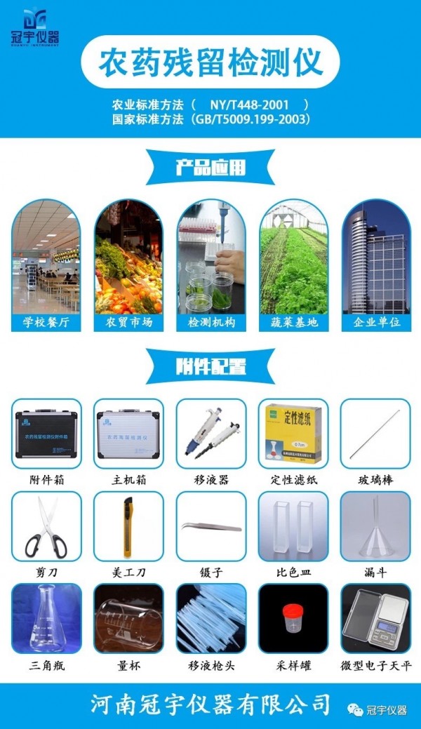 高新技术农药残留检测仪、10通道农药残留测试仪、GY-NC10高新技术农药残留检测仪是河南冠宇仪器有限公司生产的新一代智能型农药残留检测仪;GY-NC10高新技术农药残留检测仪是根据农业标准方法(NY/T 448-2001)和标准(GB/T5009.199-2003)中的酶抑制率法,严格遵循《GB/T5009.199-2003蔬菜中有机磷和氨基甲酸酯类农药残留快速检测方法标准》中的规定对蔬菜中有机磷和氨基甲酸酯类农药残留的快速检测。