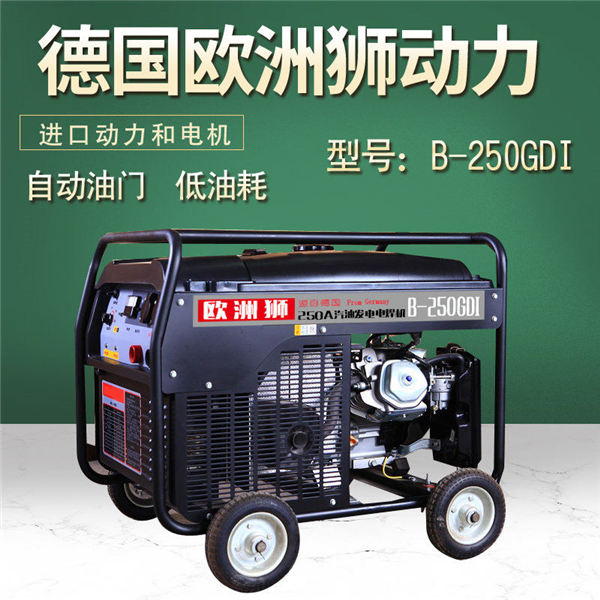 湖南用250A汽油发电电焊机 采用IGBT斩波,再加上脉宽调制和电抗器平波技术, 使得焊接电压波形更平稳。焊接时电流不过零,电流波动小,焊缝质量高。采用九相全波整流 焊接电流平稳,飞溅小焊口平滑,本机重量轻,体积小,配有移动轮,移动方便,安全可 靠,特别适用于市政抢修或野外特殊环境使用,优化设计,直喷节能,油耗率比同类机型降低3%以上,采用加重大惯量飞轮,起动更轻松,运转更平稳、功率更强劲。