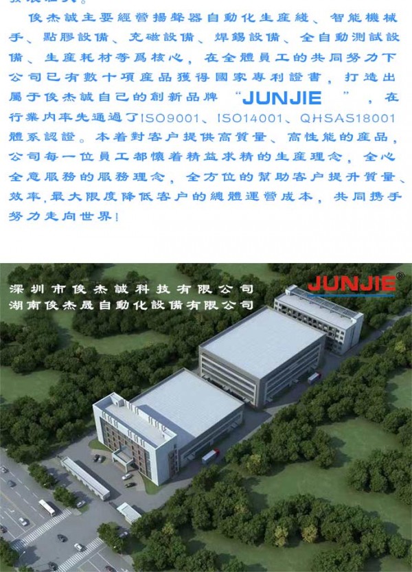 俊杰诚主要经营扬声器自动化生产线、智能机械手、点胶设备、充磁设备、焊锡设备、全自动测试设备、生产耗材等为核心,在全体员工的共同努力下,公司已有多项产品获得国家认可,打造出属于俊杰诚自己的创新品牌“JUNJIE”,并率先通过了ISO9001、ISO14001、QHSAS18001体系认证。本着对客户提供高质量、高性能的产品,公司每一位员工都怀着精益求精的生产理念,全心全意服务的专业团队,全方位的帮助客户提升质量、效率、和产能,zui大限度降低客户的总体运营成本,携手共同努力走向世界!
