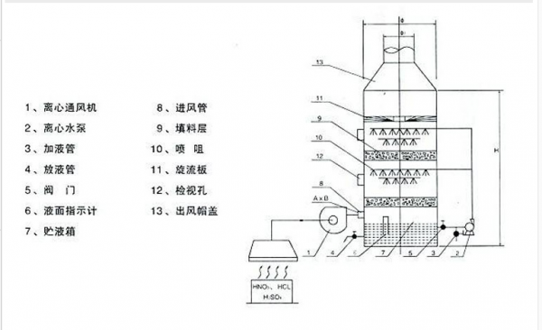 pp喷淋塔的内部结构和工作原理,工业产生的酸碱废气从喷淋塔的底部进风口被送入塔底部,在塔底部由下至上经穿过填料层,利用循环水泵将循环药水打入喷淋塔内,再从喷淋层以雾状喷下被淋湿的填料,这样就在填料的表面形成了流动的吸收液膜。产生的废气在风机的有效作用下,与循环水呈气、液两相逆流接触,这样污染物废气就会被循环水有效吸收,经过净化后的气体由经除雾装置脱去水雾后,由PP喷淋塔顶部出风口排出塔体。 烟气进入对喷咀内水面冲激、粗粒粉尘因惯性碰撞,被水液捕获沉降,为冲激阶段;喷咀缝隙旋流高速喷射,激发大量沿筒体旋流的气泡和水花,强化了烟尘膜化与凝聚作用,气泡不断发生与破裂,形成强烈的旋流扰动,烟尘不断被洗涤吸收在筒体边沿沉降,形成泡沫作用阶段;气流穿过泡沫层进入被激起的水花与雾滴区,受到淋浴洗涤,烟气得到了进一步吸收净化,即淋浴的作用阶断;含一定雾滴的烟气上升到级锥形脱水板时受到拦截,并沿壁流下,具有既脱水双除尘的第四段作用,整个过程除尘与脱硫是统一的,SO2气体充分的水液吸收剂,气泡、水雾接触完成了脱硫作用(见湿法除尘器脱硫)。