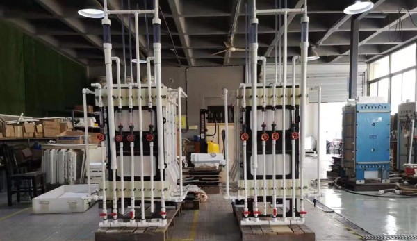 扩散渗析工程膜堆(DD-5000)大小为600mm*1200mm,一般为200对国产膜。产能为200L/h或5t/d,若降低流速能适当提高回收率。
