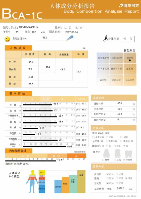 清华同方体测仪BCA-1C带有体重、去脂体重(FFM)、肌肉量、总水分(TBW)、蛋白质、骨质、脂肪、体脂百分比(PBF)、体质指数(BMI)、内脏脂肪水平、身体水分率(PBW)、体型类型、身体年龄、健康评分的一些数据