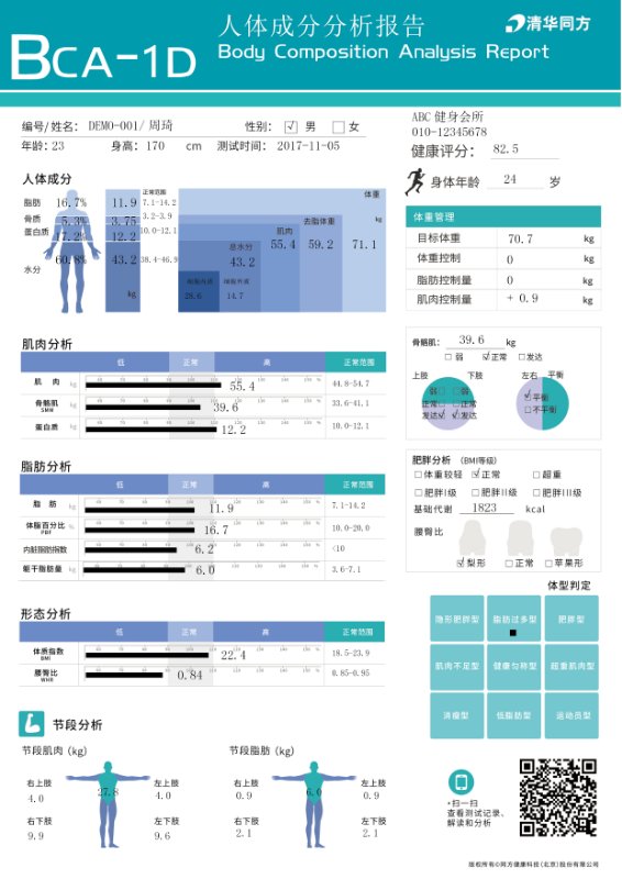 BCA-1D体测仪数据量多带有骨骼肌 内脏脂肪跟节段分析等一些数据,非常接近医院的标准跟带有医疗器械证的BCA-1B的相差只有千分之一,数据精细,可以直连打印机打印A4报告还可以微信扫码预知身体情况。