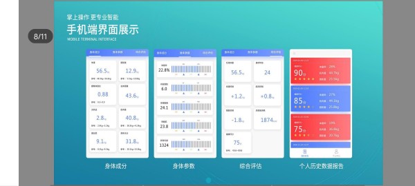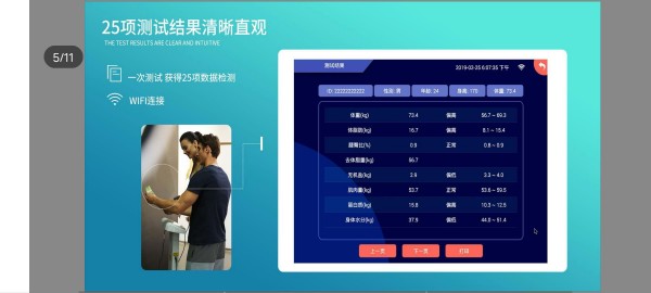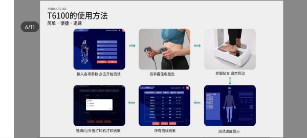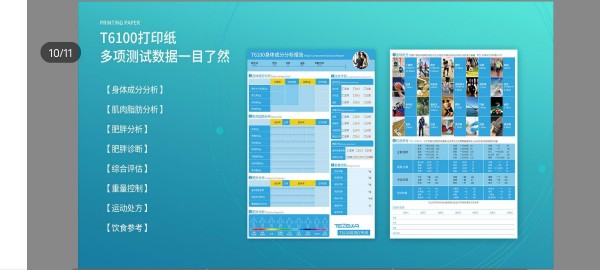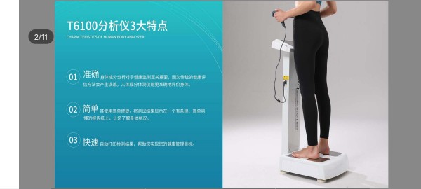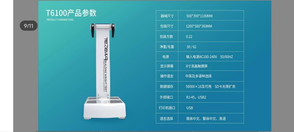 TEZEWA体测仪应用多频率生物电阻抗测试原理采用8点触摸式电法来测试人体各部位生物阻抗,检测人体各种组成元素,对人体健康状况进行分析(包括:体重、蛋白质、脂肪、水份、无机盐、腰臀比率等)。可为控重、减肥、纤体、肌肉训练、营养平衡和诊断疾病等方面提供科学有效的数据。本仪器具有身体成份分析、肌肉脂肪分析、