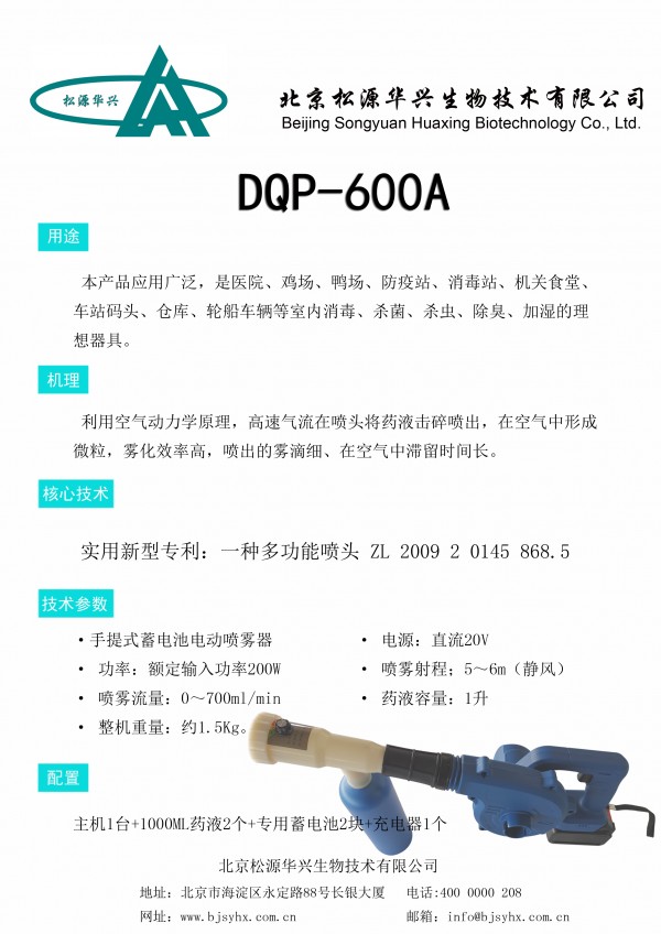 气溶胶喷雾器DQP-1200A、DQP-800、DQP-1200B曾在2003年的SARS预防工作方面做出了重要的贡献!全新DQP-600A喷雾器经过市场调研研发产品,重量轻携带方便,药业瓶更换方便,喷雾颗类可调适用于超低让量给液及动物呼吸试验。蓄电池更换设计让产品更好额应用于移动工作场所灭菌(献血车、救护车、移动工作站、船舶等)