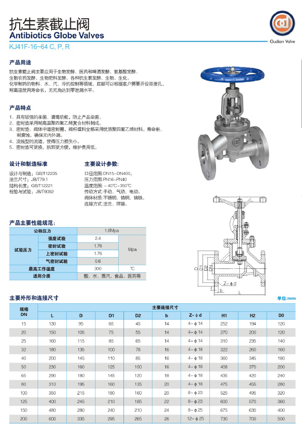 抗菌素截止阀优点:1.阀座密封宽于普通型的 密封性更好。2.阀瓣左右晃动很小,阀瓣与阀杆上下。3.高度间隙很小。(阀座密封面宽不容易破坏四氟垫,阀瓣左右不晃动平装、竖装都可以。