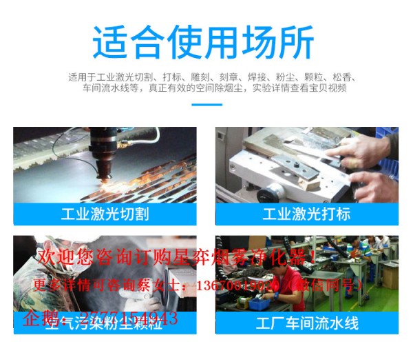 电子电器烙铁焊锡、锡炉浸锡、SMT波风炉、回流炉;激光焊接、切割、打印、雕刻、喷码;美容、艾灸、酒店、KTV包房、棋牌室、医院手术室、化学实验室;电焊、氩焊、等离子切割、金属抛光车削;LED制造、汽车制造、家具生产、各种首饰品制造、喷涂、电镀,印刷等领域,为用户改善生产环境、提高了生产效率,并降低了生产成本。