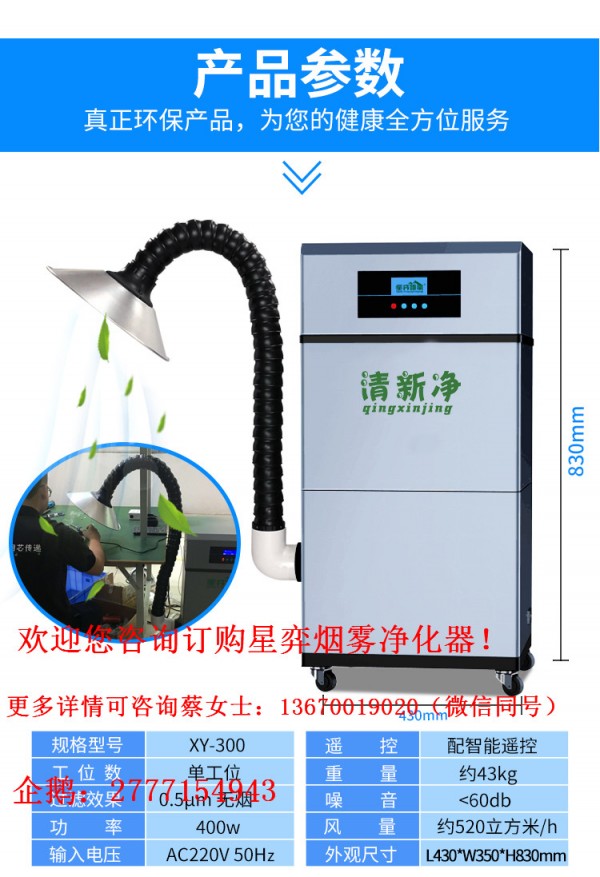 电子电器烙铁焊锡、锡炉浸锡、SMT波风炉、回流炉;激光焊接、切割、打 印、雕刻、打标、喷码;美容、中医艾灸、酒店、KTV包房、棋牌室、医院手术室、化学实验室;电 焊、氩焊、等离子切割、金属抛光车削;LED制造、汽车制造、家具生产、各种饰品制造、喷涂、 电镀,印刷等领域,为用户改善生产环境、提高了生产效率,并降低了生产成本。