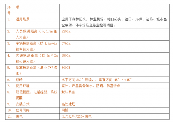 ●远距离森林防火监控,3公里-100公里360度,监管森林防火,火灾预警,报警自动弹图,短信,语音,平台提醒;可见光检测烟雾,红外检测火点,实现全自动检测。