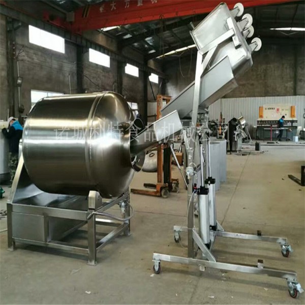把调味的辅料和猪肉、羊肉、鸡肉等物料一起放入真空滚揉机中立即进行抽真空,同时通过机器满速运转,利用物理冲击原理,肉块在滚筒内上下翻动,互相撞击,摔打,这样,可使原来僵硬的肉块变软、肌肉组织变松、腌渍液容易扩散、肉发色均匀、同时起到拌和作用