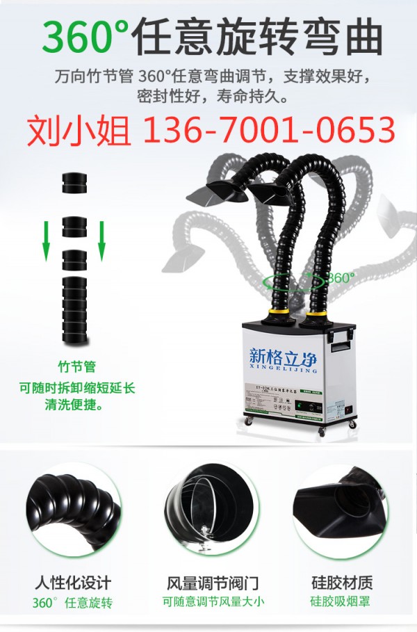 ◆机器配以万向吸烟臂,可随意变向、定位(长度可根据客户要求定制)。端部装以集烟罩,造型独特,吸烟效率更高。