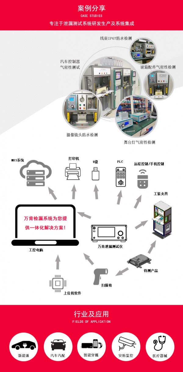 万肯机械研发生产的气密性测漏仪在国内检测行业里处于先进水平,部分领域逐渐代替进口仪器,为国内的生产制造和质量检测降低采购成本,部分功能在国外技术的基础上进行了消化吸收和改进,公司气密性检漏仪产品采用全中文的菜单,更符合国内生产的使用要求;简单易用的压力调整装置,更适应制造现场的可操作性;正负压一体检漏仪、双压力检漏仪、12通道检漏仪更是提高了企业的生产效率,同时降低企业对仪器数量的要求;更降低了工人的劳动强度,公司的气密性检漏仪产品广泛应用于汽车零部件,燃气具、医疗卫生、机械阀门等行业。