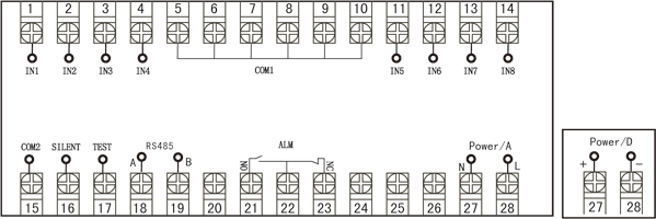 参数功能   注:1、IN1-IN8为八个输入通道,COM1为8个输入通道的公共端;2、SILENT和TEST分别为消音测试按钮,COM2为SILENT和TEST的公共端;