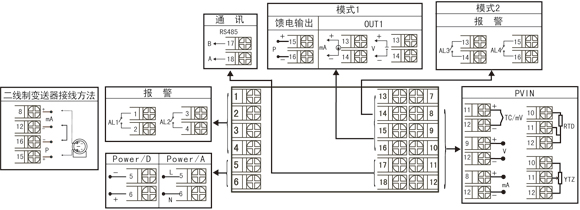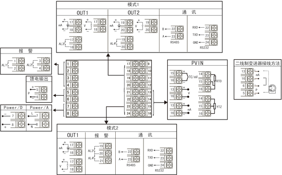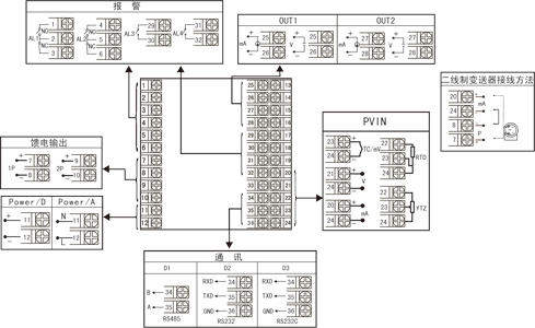 ★ 注:上述接线图中在同一组端子标有不同功能的,只能选择其中一种功能。如RS485和RS232在同一组接线端子上,只能选择一种。