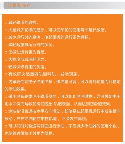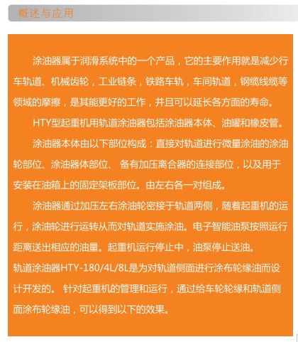 HTY-180/4L起重机用轨道涂油器属于润滑系统中的一个产品,它的主要作用就是减少行车轨道、机械齿轮、工业链条、铁路车轨、车间轨道、钢缆线缆等领域的摩擦,是其能更好的工作,并且可以延长各方面的寿命。