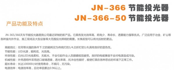 JN-365/366天车节能投光器是我公司近研制的新产品,它具有发光效率高,耗电少,寿命长,广泛应用于冶金矿山等各种室内外作业,施工现场及大型设备等大范围投光明的需要。长焦距型可以将光投射的更远。