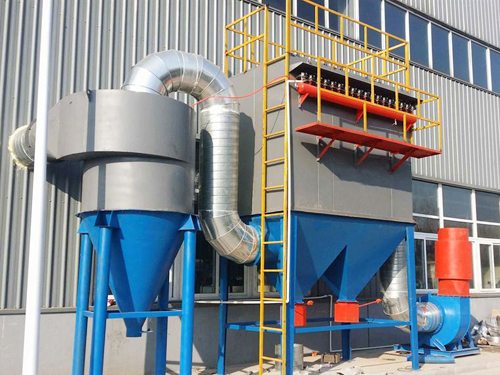 低压脉冲袋式除尘器的气体净化方式为外滤式,含尘气体由导流管进入各单元过滤室,由于设计中滤袋底离进风口上口垂直距离有足够、合理的气流通过适当导流和自然流向分布,达到整个过滤室内空气分布均匀,含尘气体中的颗粒粉尘通过自然沉降分离后直接落入灰斗,其余粉尘在导流系统的引导下,随气流进入中箱体过滤区,吸附在滤袋外表面。过滤后的洁净气体透过滤袋经上箱体、排风管排出。