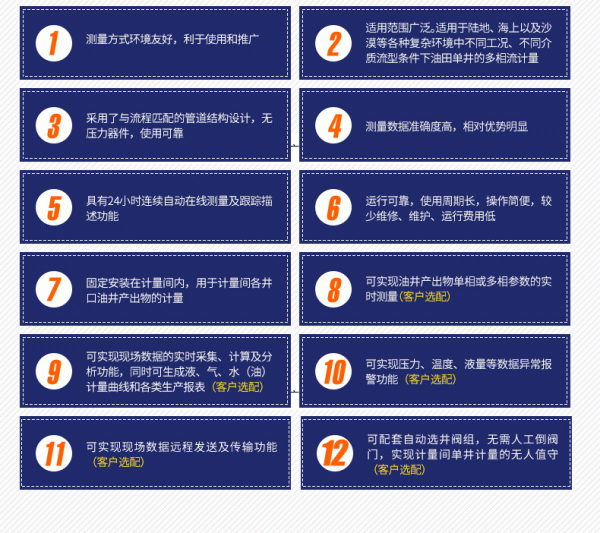 计量间油井多参数计量装置、计量间油井多参数计量装置、计量间油井多参数计量装置是用于油井产出物的多相分离及计量。装置安装于现场计量间内,用于计量间内各油井产出物的多相测量。可配套选井阀组,在系统的控制下,实现每口油井测量端口的自动切换和定时测量,免除人工倒阀门的工序,减轻员工劳动强度,可有效解决传统计量方式中普遍存在的间歇取样精度差、劳动强度大、数据反映不及时等诸多现实难题,有助于及时获取客观数据及时分析和研究单元区块油井的产量变化,为油藏动态管理提供可靠的依据。