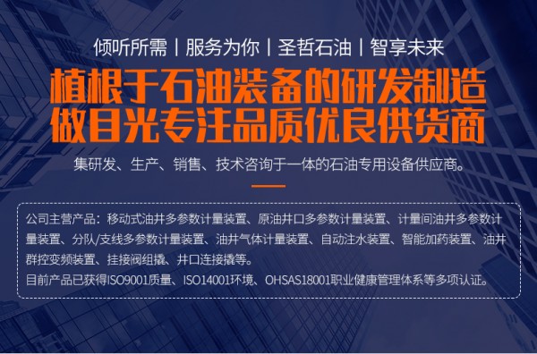 公司主营产品:油井多参数计量装置、油井气体连续分离装置、自动注水装置、智能加药装置、油井群控变频装置、挂接阀组撬、井口连接撬等。目前产品已获得ISO9001质量、ISO14001环境、OHSAS18001职业健康管理体系等多项认证。