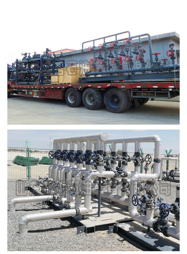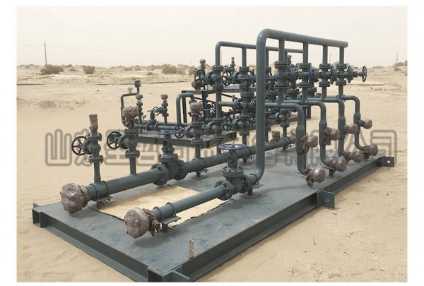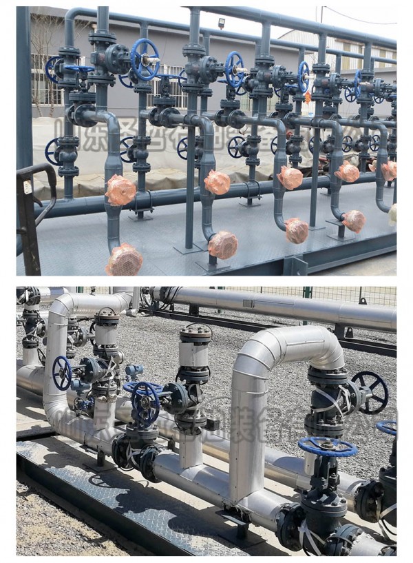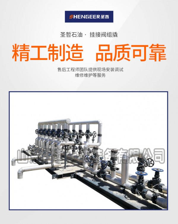 挂接阀组撬,适用于井场多相油井来液的流程切换与多参数的分组计量。利用阀组撬的管线连接不同油井的来液,通过阀门进行来液流程的切换,将想要计量的一口或多口油井通过阀门与管线的配合连入计量装置中进行计量。同时,将水源连入阀组撬的对应阀门和管线,利用压力将水反打回对应的油井,可实现油田低压注水和油井洗井的功