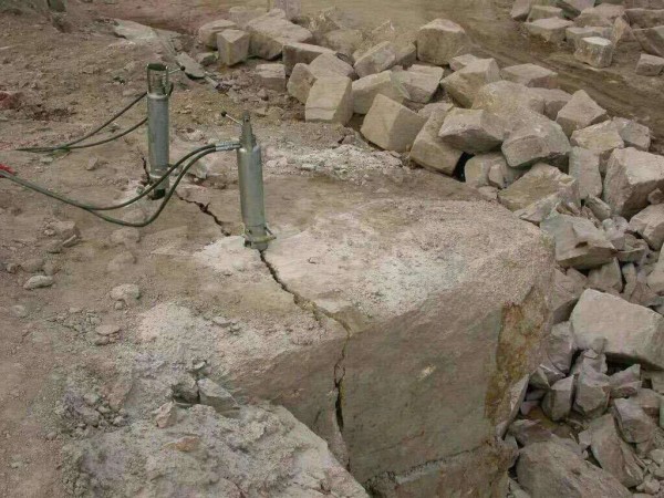 液压劈裂器是以高压油为能量源,并巧妙地应用斜契原理,使劈裂力达到几百吨,甚至上千吨,这样就可以在几秒钟时间内把上千吨的巨石轻而易举地劈裂开,从而使坚硬而巨大的矿石从山体中分离。