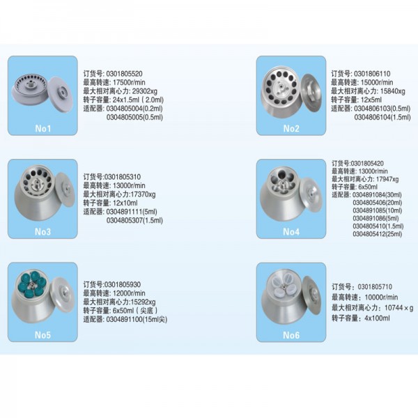 2、自动识别13种不同转子既可微量离心12x1.5ml转子(高转速达17500r/min),又可简易检验(4x100ml)转子,配多种适配器。