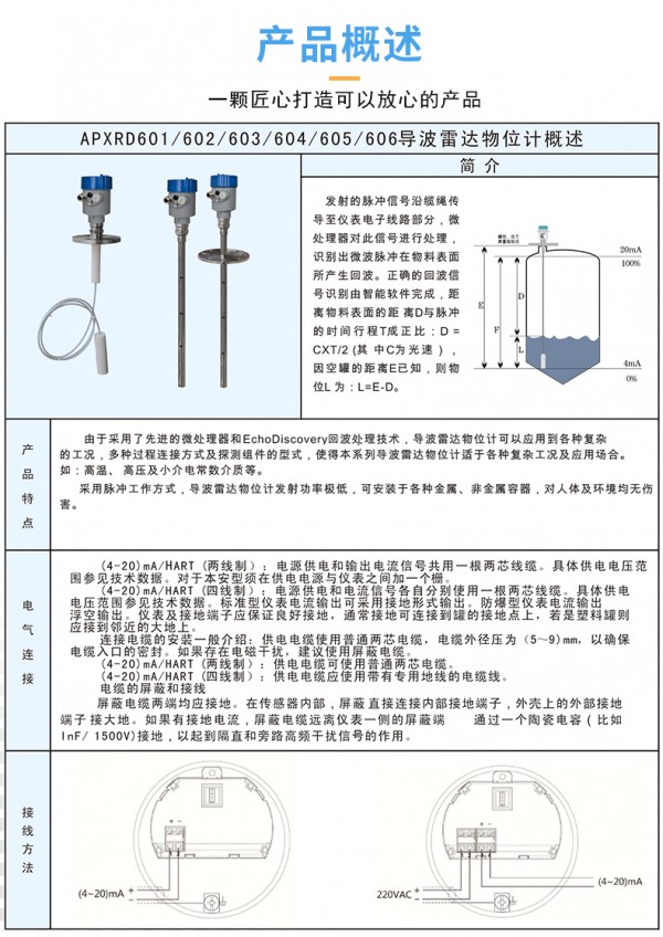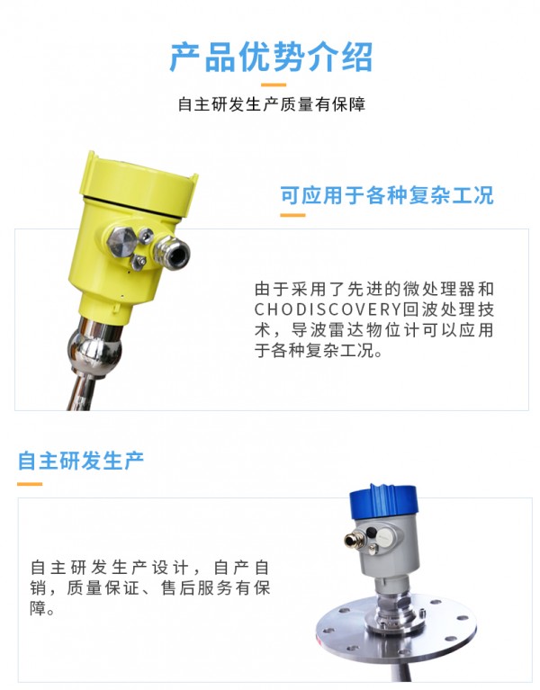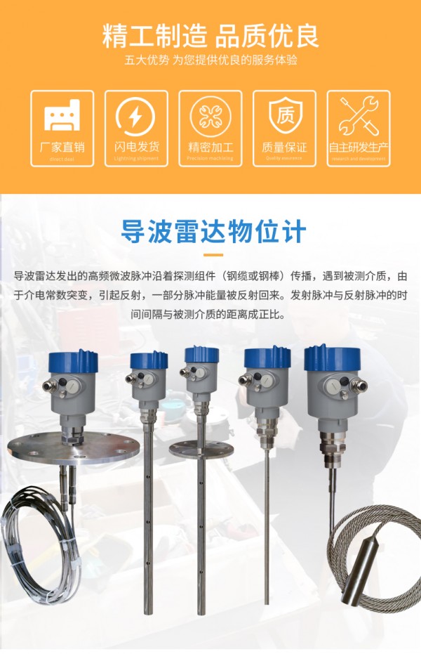 杆式导波雷达物位计由于采用了的微处理器和独特的EchoDiscovery回波处理技术,杆式导波雷达物位计可以应用到各种复杂的工况,多种过程连接方式及探测组件的型式,使得本系列导波雷达物位计适于各种复杂工况及应用场合。如:高温、 高压及小介电常数介质等。