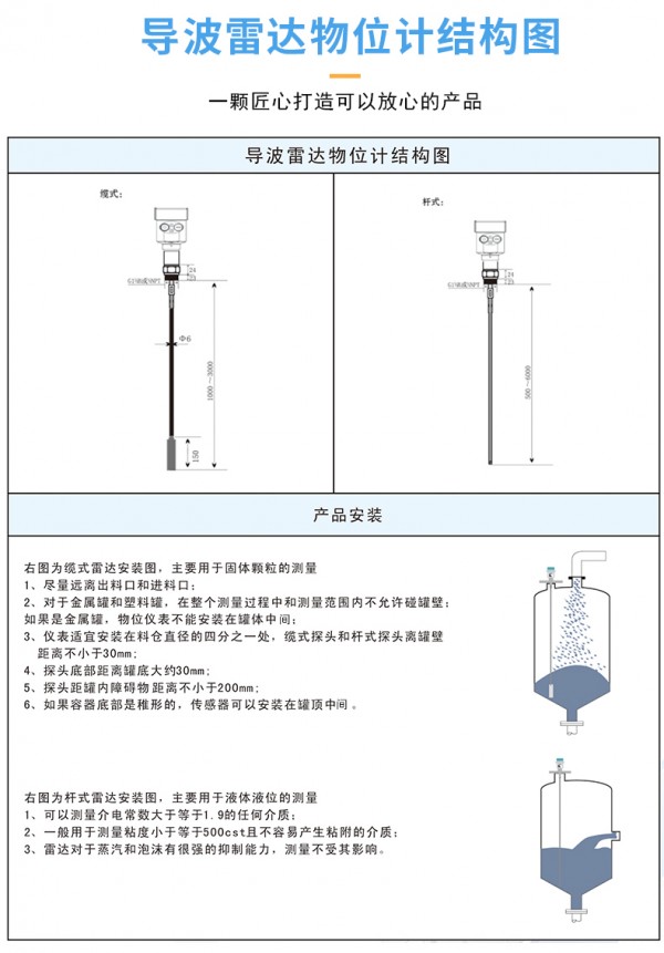 采用脉冲工作方式,杆式导波雷达物位计发射功率低,可安装于各种金属、非金属容器,对人体及环境均无伤害。