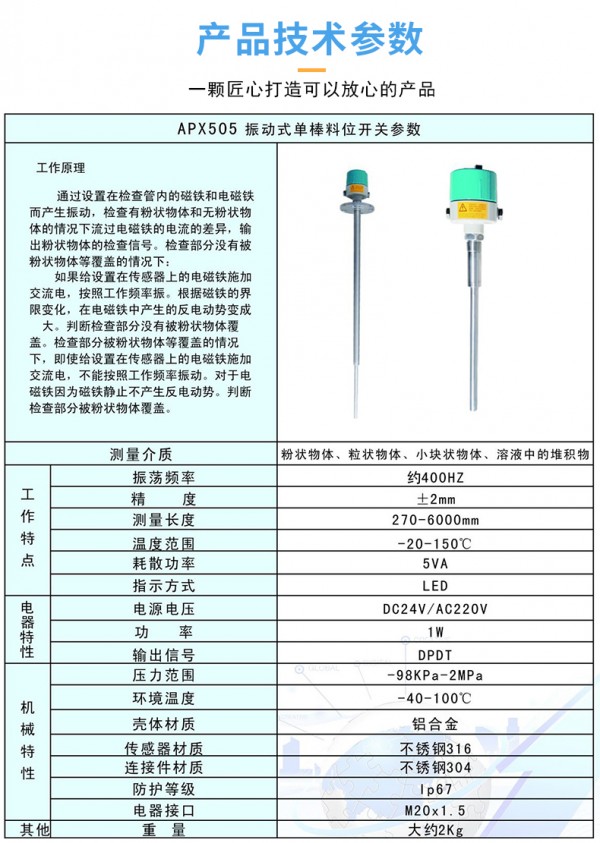 免责声明:以上所展示的[APX505 标准型单棒震动式料位开关]信息由会员[济宁艾普信仪表自动化有限公司]自行提供,内容的真实性、准确性和合法性由发布会员负责。