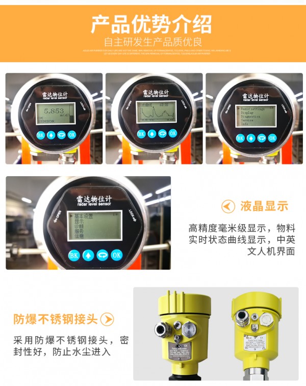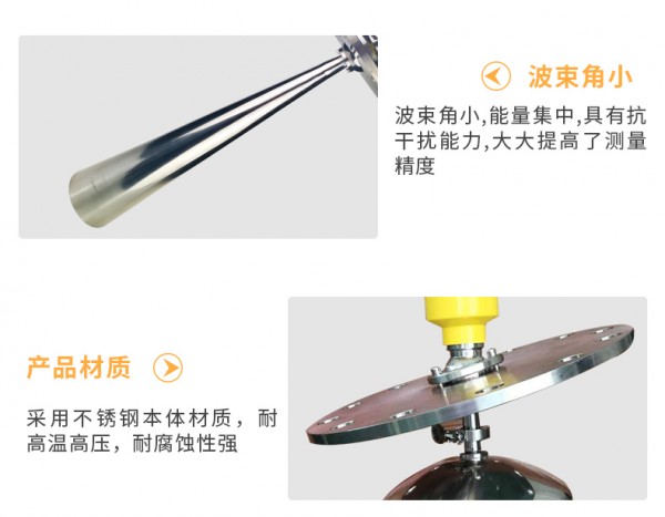 96喇叭口高频雷达物位计由于采用了的微处理器和独特的EchoDiscovery回波处理技术,导波雷达物位计可以应用到各种复杂的工况,多种过程连接方式及探测组件的型式,使得本系列导波雷达物位计适于各种复杂工况及应用场合。如:高温、 高压及小介电常数介质等。