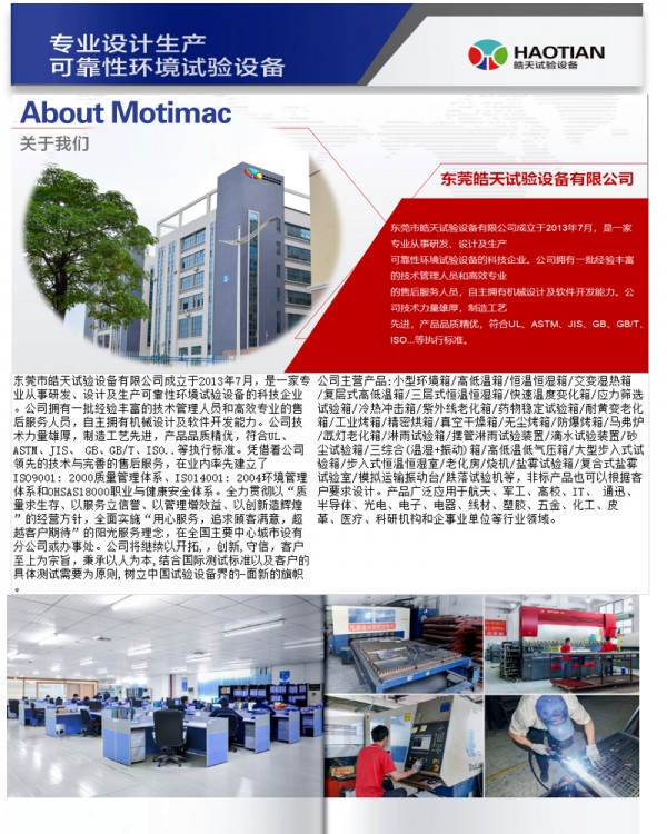 东莞市皓天试验设备有限公司成立于2005年9月,是一家专业从事研发、设计及生产可靠性环境试验设备的科技企业。公司拥有一批经验丰富的技术管理人员和专业的售后服务人员,自主拥有机械设计及软件开发能力。公司技术力量雄厚,制造工艺先进,产品品质精优,符合UL、ASTM、JIS、GB、GB/T、ISO...等执行标准。