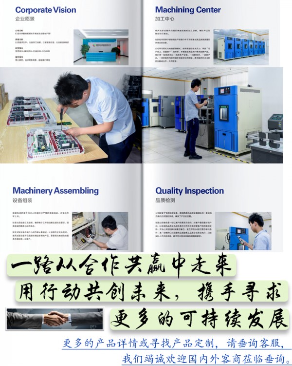凭借着公司先进的技术与完善的售后服务,在业内率先建立了ISO9001:2000质量管理体系、ISO14001:2004环境管理体系和OHSAS18000职业与健康安全体系。全力贯彻以“质量求生存、以服务立信誉、以管理增效益、以创新造辉煌”的经营方针,全面实施“用心服务,追求顾客满意,超越客户期待”的阳光服务理念,在全国主要中心城市设有分公司或办事处。公司将继续以开拓,创新,守信,客户至上为宗旨,秉承以人为本,结合国际测试标准以及客户的具体测试需要为原则,树立中国试验设备界的一面新的旗帜。