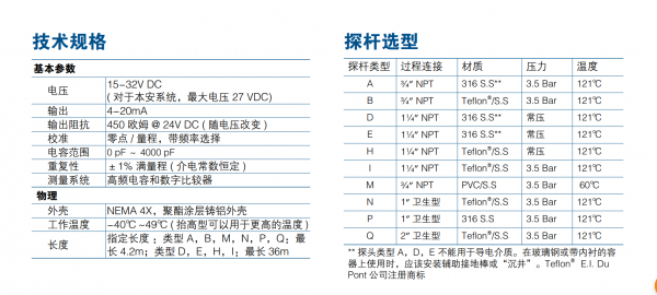 是一种的检测和控制仪表。24V2线制输入,4-20mA标准输出信号,可选的阻尼功能使其读数更加稳定(适用于有强烈搅拌的场合),简单的零点/量程调整功能便于校验。多种多样的探头形式和材质能满足不同的使用要求,比如带紧固装置的“E”型和“H”型探头可以用于高储罐场合,还能调整线缆的松紧程度。