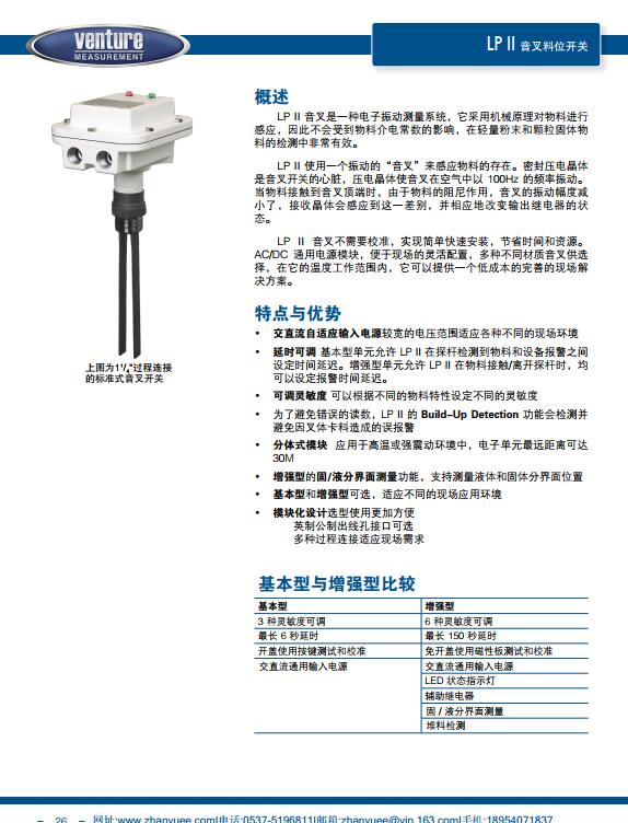 LPII音叉不需要校准,实现简单快速安装,节省时间和资源。AC/DC通用电源模块,便于现场的灵活配置,多种不同材质音叉供选择,在它的温度工作范围内,它可以提供一个低成本的完善的现场解决方案。特点与