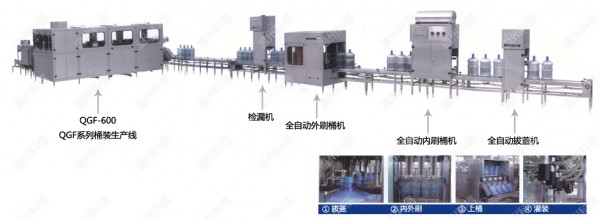 温州科信桶装水生产线设备是3-5加仑桶装饮用水生产之用,该系列桶装水生产线由洗瓶、灌装、封口三部分组成。该系列生产线均可自动洗涤、消毒、灌装、压盖、计数和输出,具有功能齐全、设计新颖、自动化程度高等特点,是集机、电、气于一体的饮用水桶装设备。