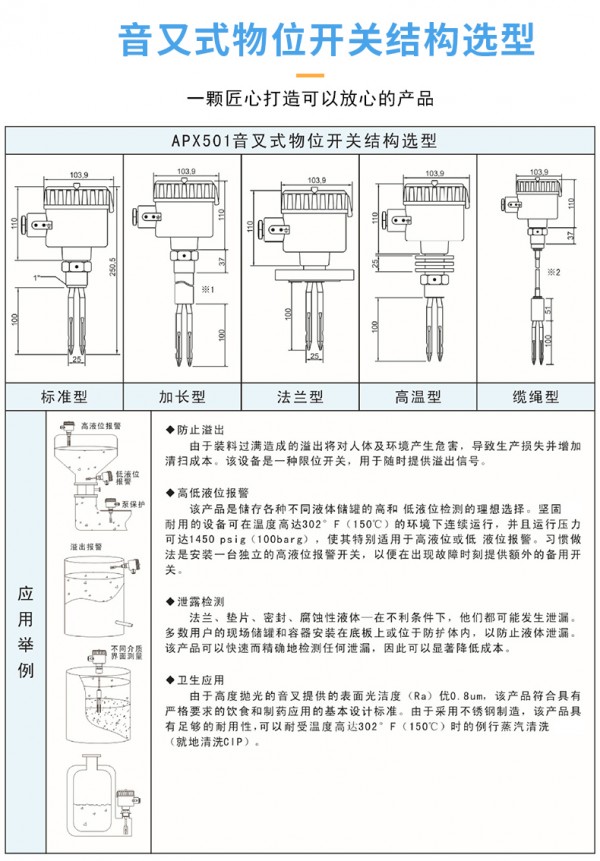 艾普信小叉加长型音叉物位开关厂家 产品有24V及220V可供选择,输出标准方式为继电器接点输出。输出模式为双刀双掷(DPDT)或根据用户需求定制。灵敏度和延迟可调,并有工作及输出指示,观察状态直观明确。