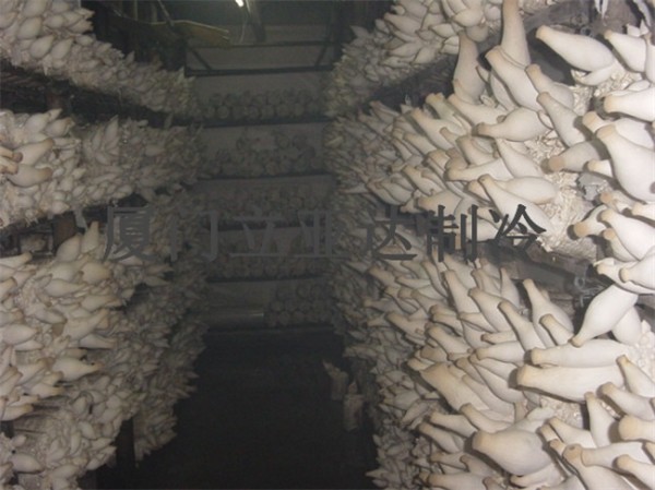 每间菇房配置一套5-8HP的制冷系统。通常制冷机组主机安装在走廊或者室外,若是风冷机组主机也可安装在屋顶上。菇房内靠近走廊侧上方安装一台专用冷风机,其不同于冷库用的冷风机,确保出风均匀柔和不伤及菇体。