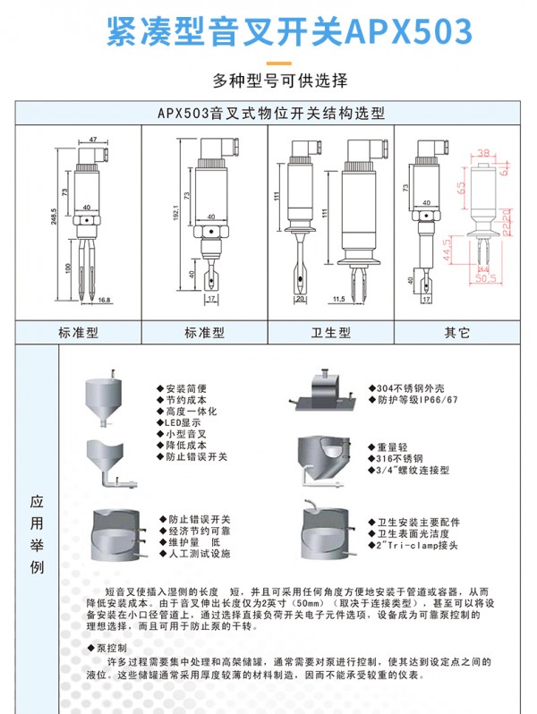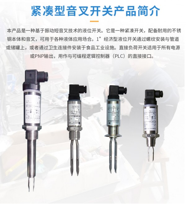 本产品是一种基于振动短音叉技术的液位开关。它是一种紧凑开关,配备耐用的不锈钢本体和音叉,可用于各种液体应用场合。1”经济型液位开关通过螺纹安装与管道或储罐上,或者通过卫生连接件安装于食品工业设施。直接负荷开关适用于所有电源或PNP输出,用作与可编程逻辑控制器(PLC)的直接接口。提供防止溢出认证,仅适用于安全区域。