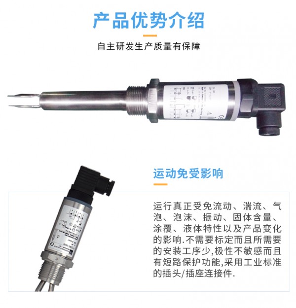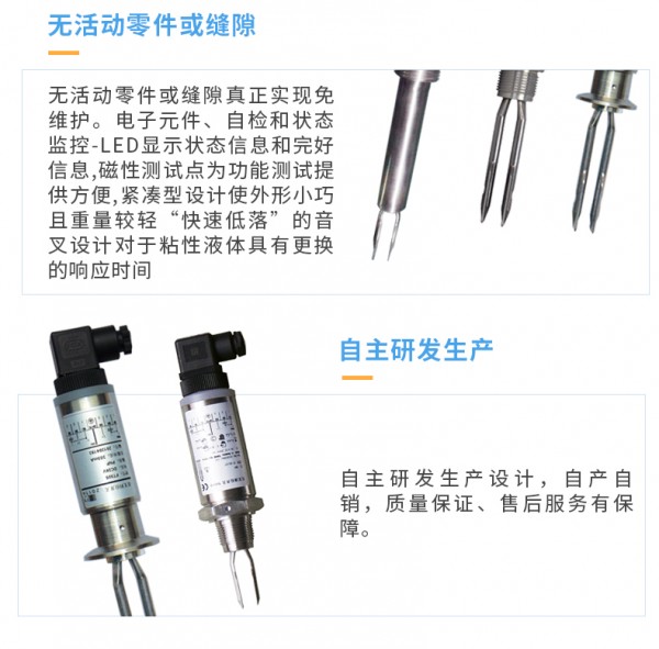 选择音叉的固有频率(约1300Hz),一防止受到设备振动的干扰,这种干扰可能引起错误的开关动作,音叉的长度较短从而使伸入容器或管道的长度达到短,由于该产品的设计采用短音叉技术,因此实际上可用于所有液体应用场合。大量的研究已使音叉设计达到高的运行频率,从而使该产品适用于所有的液体,包含涂覆液体(消除音叉粘连搭接)、充气液体和浆液。
