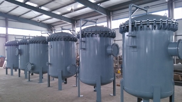 多级过滤器主要由一级旋风分离器、二级惯性除沫器预滤和凝聚、三级精滤芯凝聚、排污阀等组成,夹带液体和固体颗粒的燃气,由进气管以切线方向进入一级旋风分离器。经过旋风分离,较大的液滴和固体颗粒被分离出来。然后,经过二级除沫器,气体通过惯性碰撞作用下,气、液、固进一步分离。气体中粒径较大的尘埃被滤除,对后级精滤芯起保护作用。气体通过精滤芯(第三级精滤),粒径大于10微米(或更细)的固体粒子被滤除;粒径微小的液态雾状物被收集在精滤芯上,并凝聚成较大的液滴,在重力作用下,沉降到精滤管底部。分离出来的液体由各排污口排出,经处理的燃气由过滤器顶端的出气口输出。本装置综合采用机械分离,微纤维过滤和微孔介质凝聚生长的原理,具有相当高的除尘过滤精度及脱湿能力。