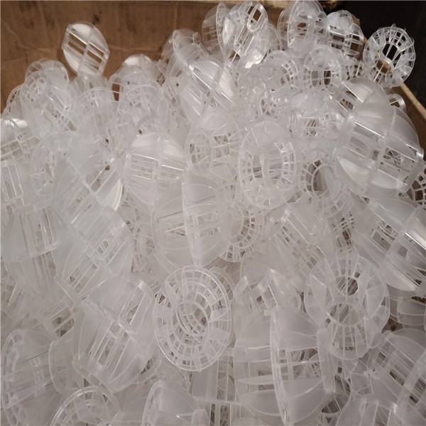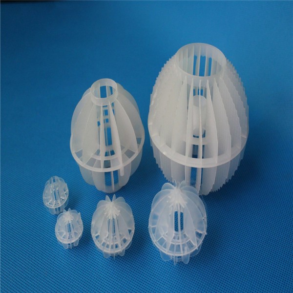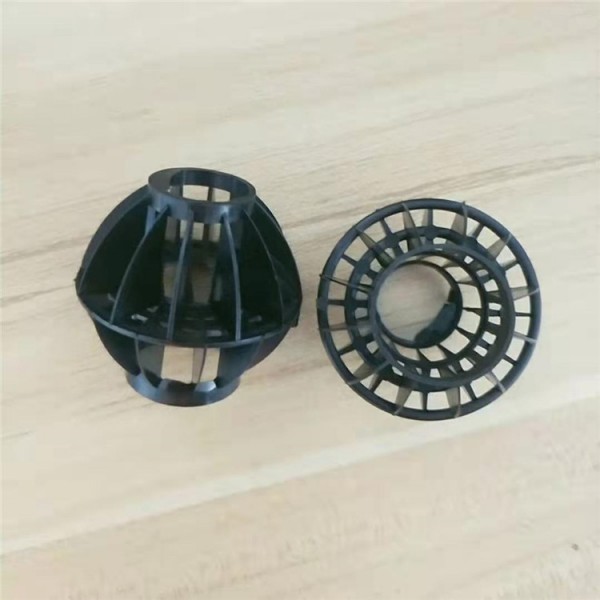 多面空心球采用聚丙烯(PP)塑料制成球状,由两个半球合成一个球形,每个半球上根据设计需要有8-12个半扇形叶片,两个半球的扇形叶片上下相互错开上,沿中心轴呈放射形布置。