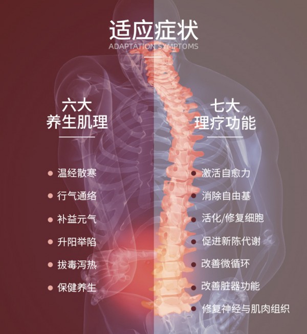 激活休眠细胞,清除血液垃圾,促进新陈代谢,给血液新的活力。经过长期对身体治疗的实践,太赫兹热能光波仪对于神精衰弱、高血压、心脑血管疾病、胃肠炎、肩周炎、颈椎炎、腰腿病、风温及类风湿性关节炎,前列腺炎及增生肥大及男科病,神经麻痹、多种扭挫伤、乳腺炎、乳腺增生、神精痛、小肠气,多种妇科疾病以及失眠多梦、眩晕耳鸣等病症有良好的治疗效果,乳腺癌,淋巴癌,糖尿病及对其它疾病有良好的疗效。