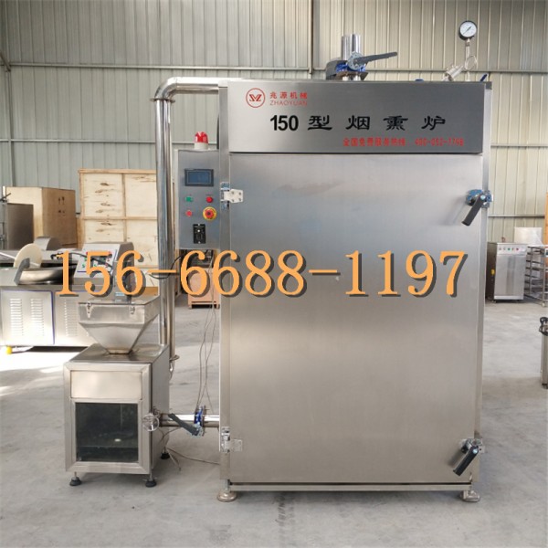 中小型红肠熏蒸机本机具有蒸汽加热(蒸煮)、热风(干燥或烘烤)、烟熏、排气等功能。