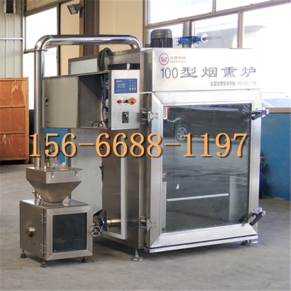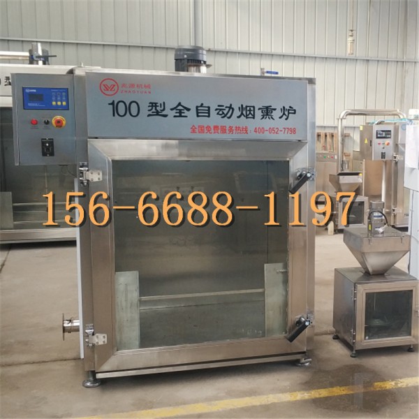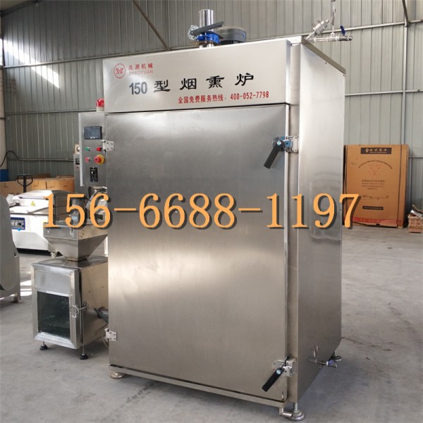 商用红肠烘熏炉烟熏炉可以加工猪头肉、豆腐干、火腿、香肠、腊肠、鸡、鸭、鹅、鱼类、牡蛎、等需要蒸煮、烘干、烟熏上色的食品。本机主要由炉体、加热系统、循环风系统、及电控系统等组成。烟熏炉是肉制品熟化过程中必不可少的设备之一, 全自动烟熏炉的触摸屏,可编程控制器及继电器,电磁阀等关键电气元件均采用进口产品。大视窗的人机界面,生动直观地显示设备运行状态,可在运行中随时调整时间、温度、湿度、排风大小等状态参数,操作非常简单。具有优异的发烟及循环系统,可使炉内的烟雾均匀分布,从而使肉制品着色均匀,色泽美观,保证产品具有较高的出品率。