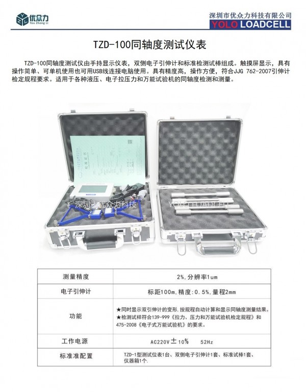 同轴度测试仪 TZD-100引伸计同轴度仪表由手持显示仪表,双侧电子引伸计和标准检测试棒组成。具有精度高,操作方便,符合JJG 762-2007引伸计检定规程要求。适用于各种液压、电子拉压力和万能试验机的同轴度检测和测量。