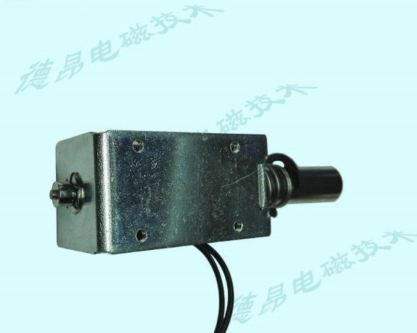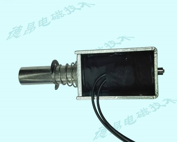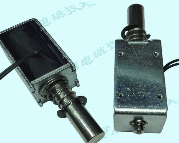 产品款式:一般电磁铁分为二种款式,拉式(可动铁芯拉动载体向前运动,用弹簧复位即可);推式(在拉式基础上增加顶杆和挡块,挡块的作用是用来限位作用,载体在前面,电磁铁前端的挡块推动载体向前运动,用弹簧复位)。