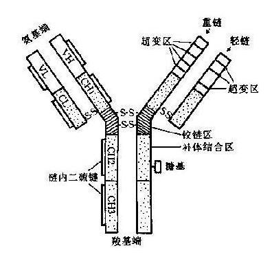 抗体是具有4条多肽链的对称结构,其中2条较长、相对分子量较大的相同的重链(H链);2条较短、相对分子量较小的相同的轻链(L链)。链间由二硫键和非共价键联结形成一个由4条多肽链构成的单体分子。轻链有κ和λ两种,重链有μ、δ、γ、ε和α五种。 整个抗体分子可分为恒定区和可变区两部分。在给定的物种中,不同抗体分子的恒定区都具有相同的或几乎相同的氨基酸序列。可变区位于"Y"的两臂末端。在可变区内有一小部分氨基酸残基变化特别强烈,这些氨基酸的残基组成和排列顺序更易发生变异区域称高变区。高变区位于分子表面,最多由17个氨基酸残基构成,少则只有2 ~ 3个。高变区氨基酸序列决定了该抗体结合抗原抗原的特异性。一个抗体分子上的两个抗原结合部位是相同的,位于两臂末端称抗原结合片段(antigen-binding fragment, Fab)。"Y"的柄部称结晶片段(crystalline fragment,FC),糖结合在FC 上。