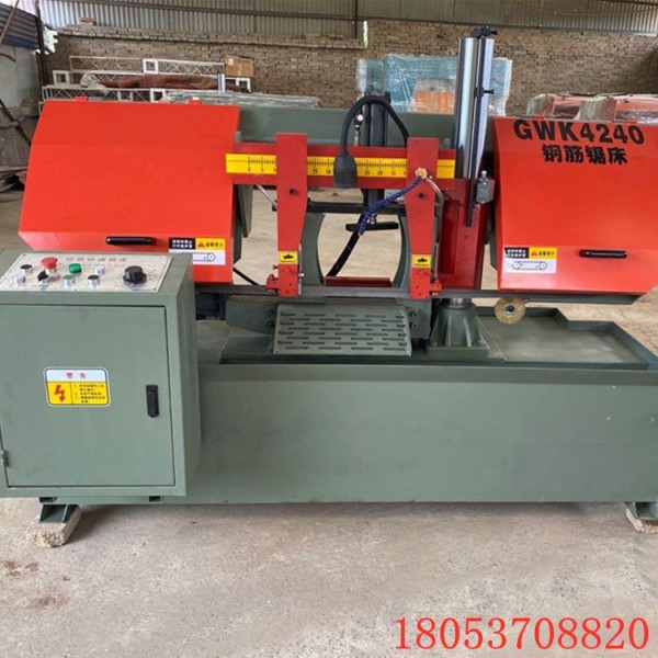 GB系列金属带锯床主要用于锯切各种黑色金属、有色金属。具有锯口窄、省料、节能、锯削精度高、操作方便、生产效率高等优点锯床主要部件有底坐;床身、立柱;锯梁和传动机构;导向装置;工件;张紧装置;送料架;液压传动;电气控制;及冷却;底座底座为钢板焊接而成的箱形结构,床身、立柱固定其上,底座内腔有较大空间,前左侧为电气按钮控制箱,右侧为电气配电板箱,中间由钢板焊成的液压油箱,装有液压泵站,液压管路。