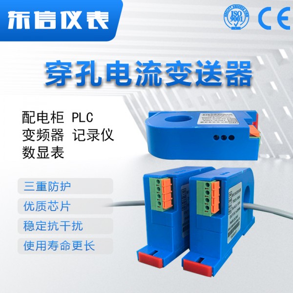 该穿孔电流变送器可以直接将被测主回路交流电流或者直流电流转换成按线性比例输出DC4~ 20mA(通过2500电阻转换DC 1~ 5V或通过5000电阻转换DC2 ~ 10V)恒流环标准信号,连续输送到接收装置(计算机或显示仪表)。